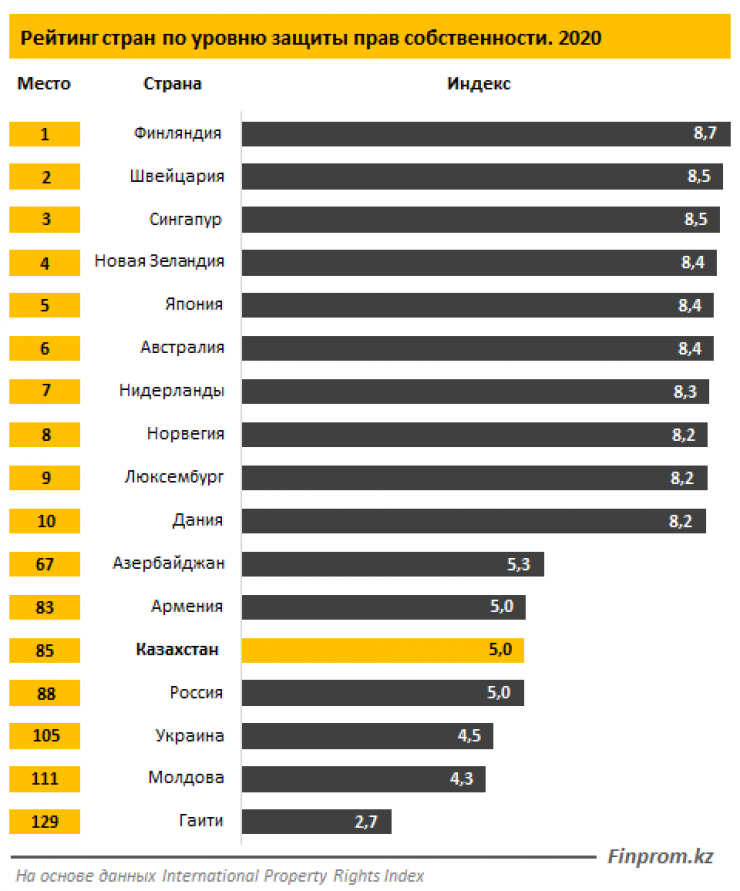 Среди стран СНГ права собственности лучше, чем в Казахстане, защищены в Азербайджане и Армении. Хуже, чем в Казахстане, показатели в России, Украине, Молдове.