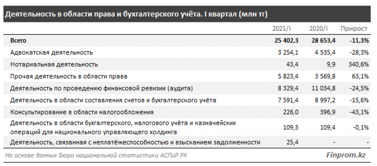 По итогам первого квартала 2021 года объем услуг, оказанных в области права и бухгалтерского учета, составил в Казахстан 25,4 миллиарда тенге тенге - на 11,3 процента меньше, чем годом ранее (ИФО - 80,6 процента).