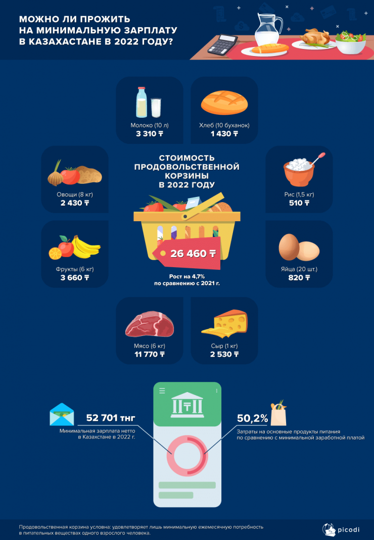 В корзину попали хлеб, молоко, яйца, рис, сыр, мясо, фрукты и овощи. Стоимость такой продуктовой корзины на начало 2022 года составляет 26 460 тенге.