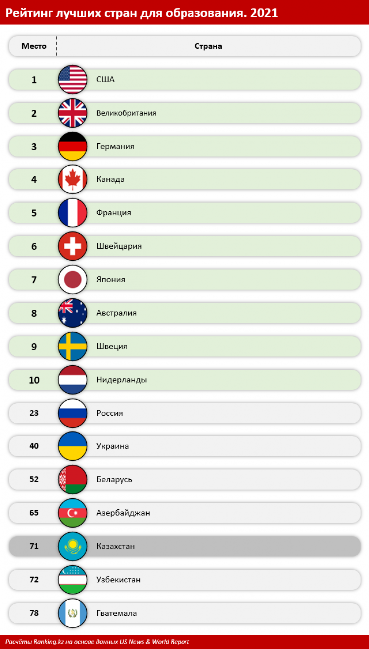 В рейтинге лучших стран для образования по версии US News & World Report Казахстан занял 71-е место из 78-ми. Эксперты Ranking.kz сравнили занятость в сфере и зарплаты преподавателей, передает Tengrinews.kz.