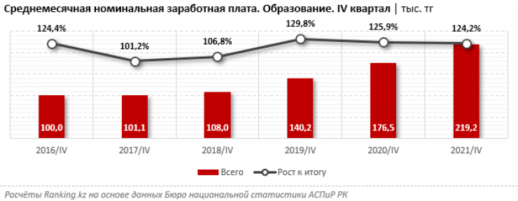 В четвертом квартале 2021 года среднемесячная заработная плата работников сферы образования составила 219,2 тысячи тенге - на 24,2 процента больше, чем годом ранее. Однако реальная покупательная способность заработных плат в секторе выросла только на 14,3 процента за год.