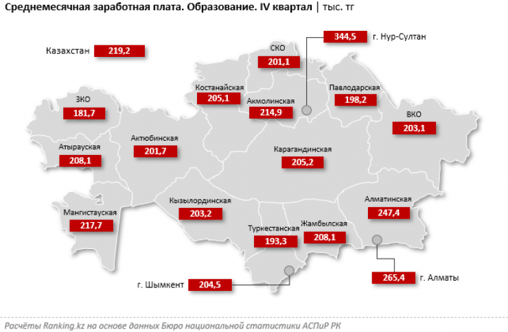 В региональном разрезе больше всего в секторе получают работники столицы: 344,5 тысячи тенге - на 15,7 процента больше, чем годом ранее. В тройке лидеров также оказались Алматы (265,4 тысячи тенге) и Алматинская область (247,4 тысячи тенге). Меньше всего работники образования получают в Западно-Казахстанской области - 181,7 тысячи тенге.