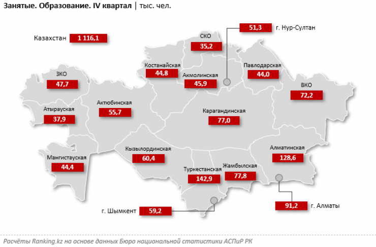 Больше всего занятых в сфере образования зафиксировано в Туркестанской области - 142,9 тысячи человек, годовой рост - на 3,2 процента. В тройку лидирующих регионов также вошли Алматинская область (128,6 тысячи человек) и Алматы (91,2 тысячи человек).