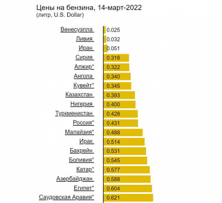 Россия расположилась на 11-м месте. Стоимость топлива там составляет 0,431 доллара, или 218 тенге. В Саудовской Аравии (19-е место) бензин продают по 0,621 доллара (314 тенге).
