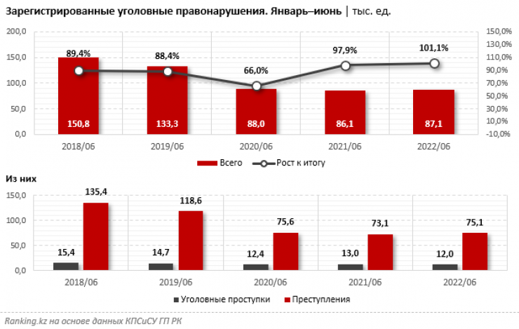 Отметим, что в первом полугодии 2022 года в Казахстане зарегистрировали 87,1 тысячи уголовных правонарушений - на 1,1 процента больше по сравнению с аналогичным периодом 2021-го, при этом за 5 лет их количество сократилось почти в 2 раза. Из них 75,1 тысячи правонарушений (плюс 2,7 процента за год) относились к преступлениям, а оставшиеся 12 тысяч правонарушений (минус 7,7 процента за год) - к уголовным проступкам.