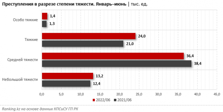 Из общего числа преступлений за январь - июнь текущего года 1,4 тысячи составили особо тяжкие, количество которых за год выросло на 10,9 процента. Количество тяжких преступлений достигло 24 тысяч - сразу на 14,5 процента больше, чем годом ранее. Больше всего преступлений относилось к средней степени тяжести: 36,4 тысячи - на 5,1 процента меньше, чем за январь - июнь 2021 года. Количество преступлений небольшой степени тяжести выросло за год на 5,9 процента, до 13,2 тысячи.