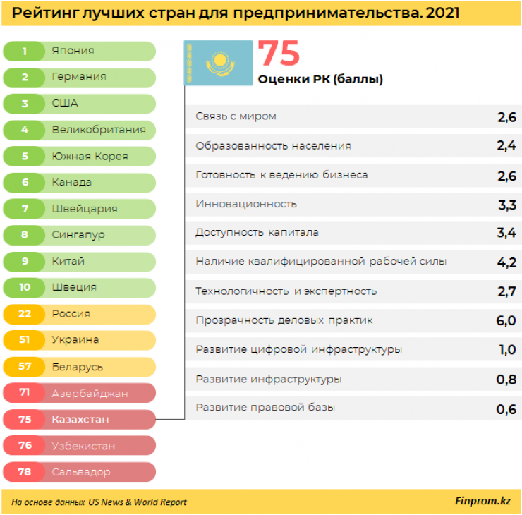 В рейтинге лучших стран для предпринимательства по версии US News & World Report в 2021 году Казахстан оказался на 75-м месте из 78. Оценка уровня развития предпринимательства в республике составила всего 0,9 балла из 100. Казахстан оценили низко по всем пунктам рейтинга, передает Tengrinews.kz со ссылкой на Finprom.