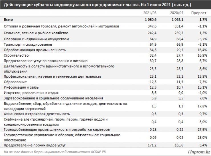 На 1 июня 2021 года в стране насчитывалось 1,1 миллиона действующих субъектов индивидуального предпринимательства - на 1,7 процента больше, чем годом ранее. 47,5 процента от общего числа ИП возглавляли женщины.