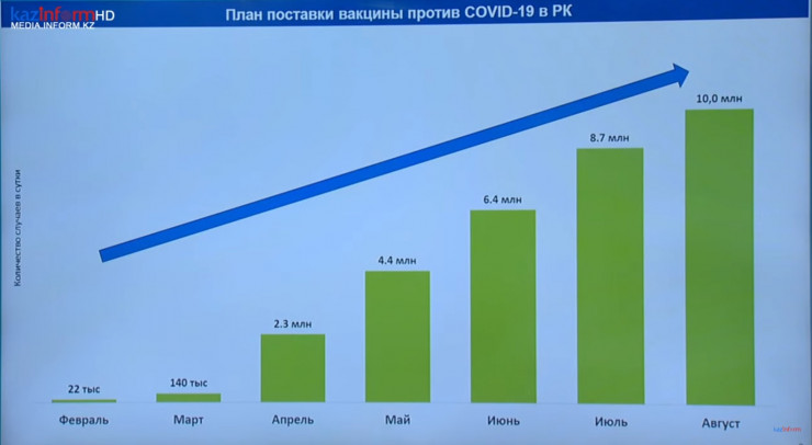 Цой заверил, что на конец апреля в страну поставлено 2,3 миллиона доз вакцины с нарастающим итогом начиная с февраля. С момента старта кампании вакцинации в Казахстане использовано около 1,8 миллиона доз вакцины против коронавируса. Таким образом, в наличии в прививочных пунктах страны должно оставаться порядка 500 тысяч доз вакцины.