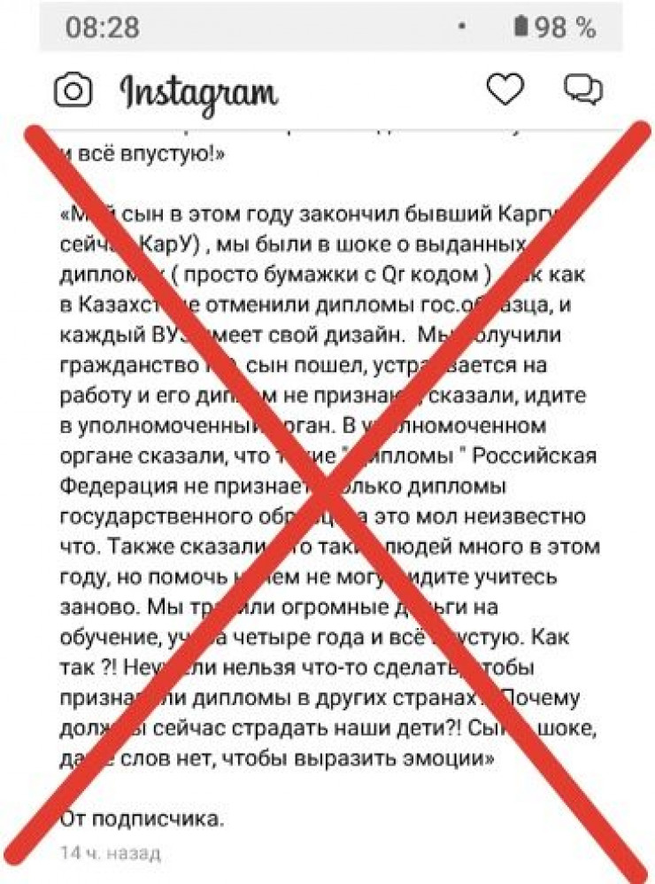 В казахстанских мессенджерах и соцсетях распространяется сообщение о том, что дипломы собственного образца казахстанских вузов недействительны в России. Эту информацию опровергли в Министерстве образования и науки, передает Tengrinews.kz со ссылкой на StopFake.kz.