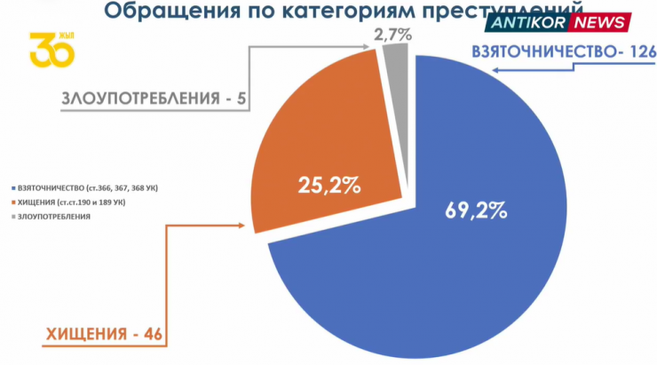 "Из поощренных в 2020 году: 122 лица сообщили о совершении тяжких преступлений, по делам средней тяжести поощрено 55 лиц, небольшой тяжести - два лица, три лица поощрены за сообщения об административных правонарушениях. Анализ показал, что в основном граждане сообщают о фактах взяточничества (статьи 366, 367 и 368 Уголовного кодекса) - 126 сообщений, или 69,2 процента, и хищения (статьи 190 и 189 Уголовного кодекса) - 46, или 25,2 процента", - отметил Бигайдаров.