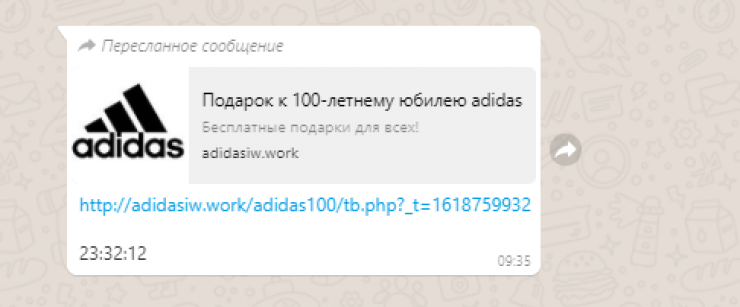В рассылаемых сообщениях говорится о подарке к 100-летию юбилея Adidas.
