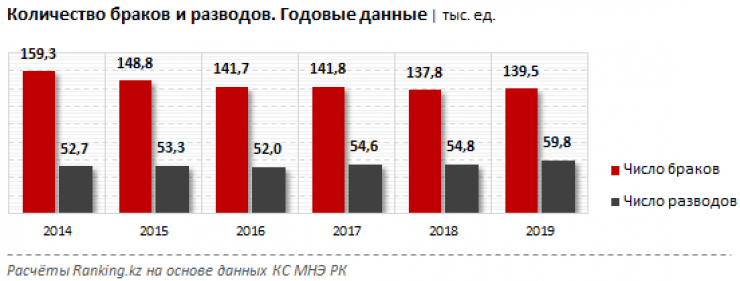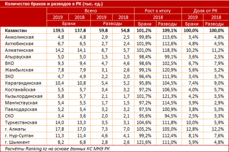 "Коэффициент брачности на 1000 человек составил 7,54, а коэффициент разводимости - 3,23. По коэффициенту брачности лидирует столица (10,22 на 1000 человек), а также Алматы (9,46 на 1000 человек) и Шымкент (8,03 на 1000 человек). По коэффициенту разводимости на 1000 человек недоброе "лидерство" держат Павлодарская область (4,24 на 1000 человек), столица (4,11 на 1000 человек) и Карагандинская область (3,91 на 1000 человек)", - говорят авторы исследования.