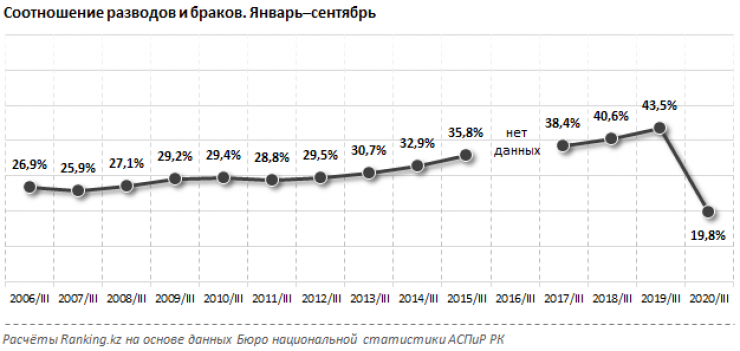 Соотношение разводов и браков за январь - сентябрь 2020 года составило рекордно низкие 19,8 процента, в то время как в прошлом году показатель, наоборот, достигал рекордно высоких негативных значений - 43,5 процента.