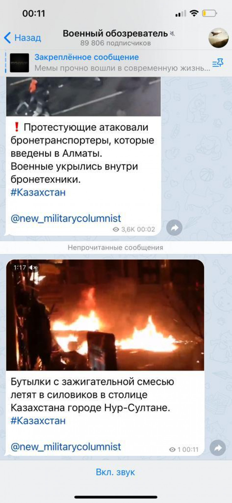 Бір хабарламада "Шерушілер Алматыға кірген брондалған көліктерге шабуыл жасады" десе, тағы бірінде "Нұр-Сұлтанда Қарулы күш өкілдеріне Молотов коктейлі лақтырғандар" туралы айтылады.