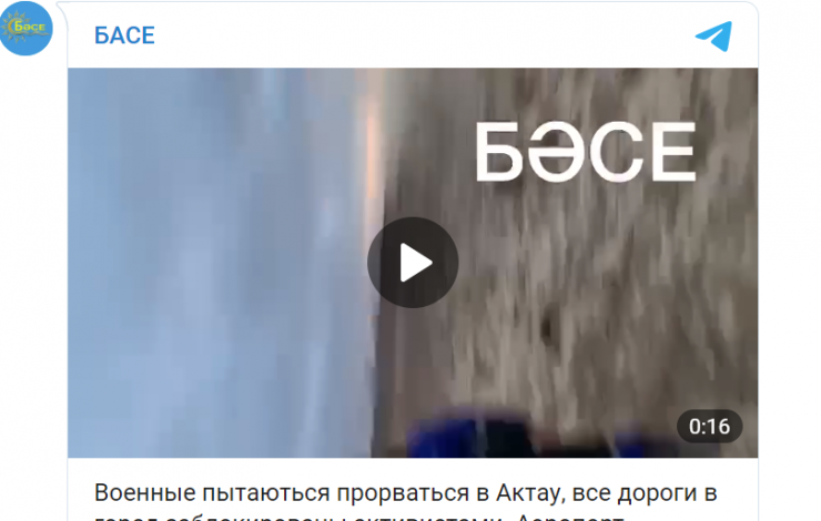 Telegram-арналарда Қазақстанда наразылық білдірушілер бронтранспортерлерге жанатын қоспасы бар бөтелкелер лақтырғаны туралы хабарламасы бар видео тарады.
