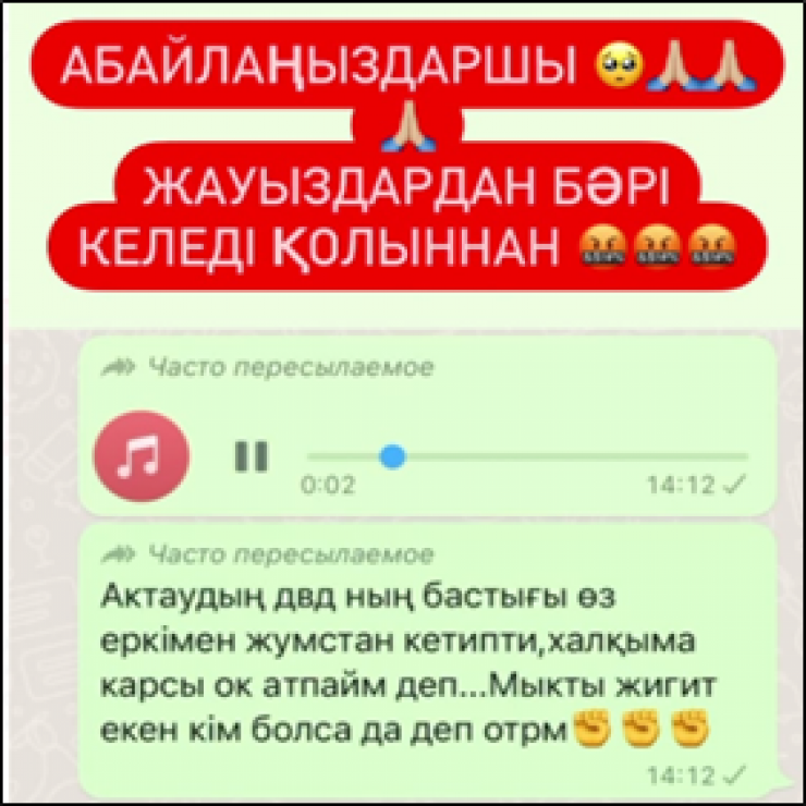 "4 қаңтарда WhatsApp мессенджерінде "Қазақпыз" чатында жалған ақпараттар жарияланды. Аудио авторының айтуынша, митингіге қатысушыларға қарсы күш қолдану туралы нұсқауға байланысты Маңғыстау облысы ПД бастығы отставкаға кеткен. Сондай-ақ, ол өрт сөндіруші болып істейтін көршісінің наразылық білдірушілерге мұзды су шашудан бас тартқанын айтты. Бұл ақпарат шындыққа жанаспайды", - деді ІІМ өкілі.