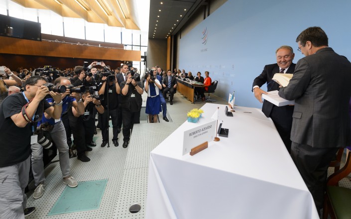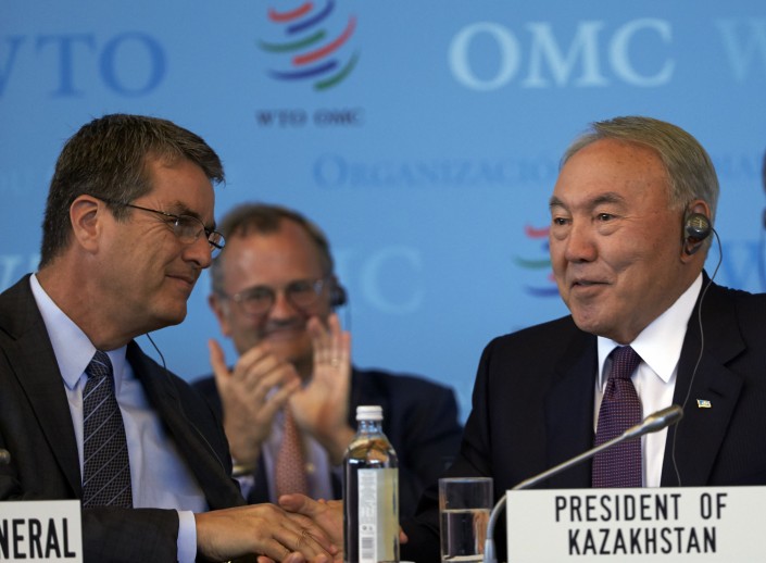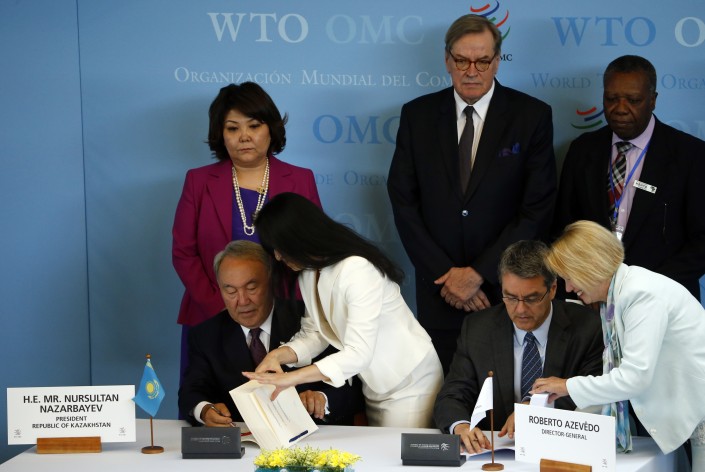 В понедельник, 27 июля, в Женеве Президент Казахстана Нурсултан Назарбаев и генеральный директор Всемирной торговой организации (ВТО) Роберто Азеведо подписали протокол о присоединении республики к ВТО, передает Tengrinews.kz со ссылкой на пресс-службу Главы государства. Таким образом, Казахстан официально вступил в ВТО после более 19 лет переговоров.
