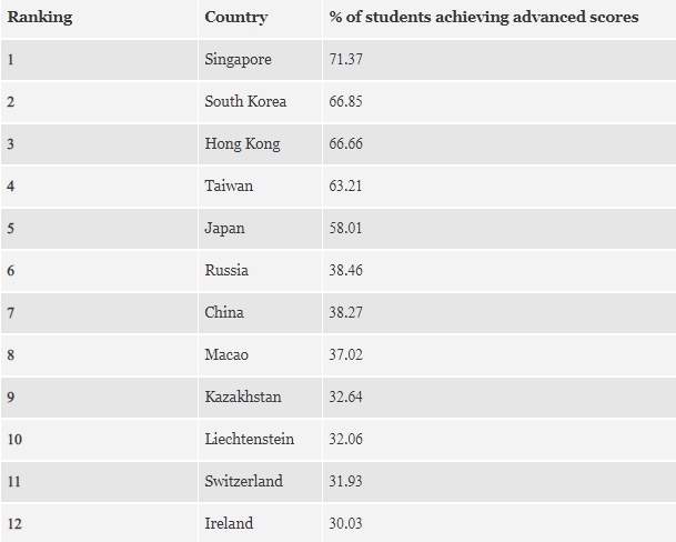 Казахстан не вошел в основной рейтинг, но занял девятое место среди всех государств мира по достижениями школьников, опередив Великобританию, Израиль, Швейцарию и другие страны. Этот результат авторы рейтинга назвали сюрпризом.