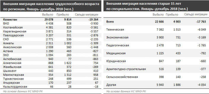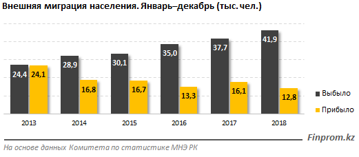 Среди трудоспособного населения за 12 месяцев 2018 года из Казахстана выбыло 29,1 тысячи человек (в том числе в страны СНГ - 26,3 тысячи человек).