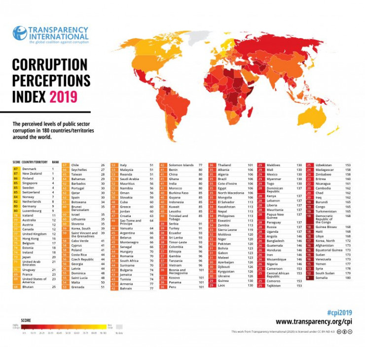 23 января 2020 года глобальное антикоррупционное движение Transparency International (TI) опубликовало индекс восприятия коррупции (CPI) за 2019 год. В рейтинг вошли 180 государств. Они получили оценки от 0 до 100, где ноль - уровень коррупции высокий, 100 - низкий.