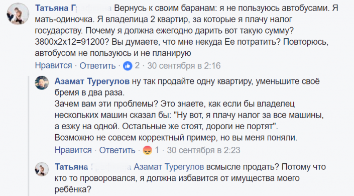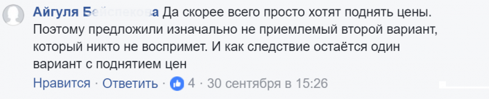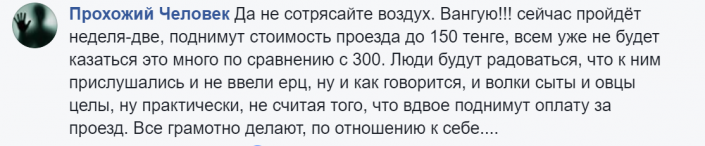 "В Астане предлагают скинуться по 3800 тенге с хаты на проезд в общественном транспорте. А можно алматинцы скинутся заранее по чирику на то, чтобы до нас никогда не доходили гениальные столичные реформы?" - пишет пользователь Facebook Ольга Знаменская (здесь и далее орфография и пунктуация авторов сохранены).