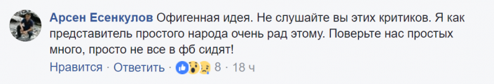 "Офигенные проект. Гонки, копоть, дтп - это ведь все искоренится. Да и взять простую семью из 5 чел, которые покупают проездные - для них это выгодно. А это простой народ и таких десятки тысяч семей", - прокомментировал Естай Жанболатов.