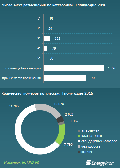 Также, согласно статистике, в стране 266 гостиниц с категориями по количеству "звезд". Еще 1,3 тысячи гостиниц являются без категории и 909 прочих мест размещения. Между тем в Казахстане всего 20 пятизвездочных отелей. Их них шесть гостиниц находятся в Алматы, пять - в Астане и четыре - в Мангистауской области. Отелей с категорией четыре звезды в стране 79, трехзвездочных - 132, двухзвездочных - 20 и гостиниц с одной звездой - 15.