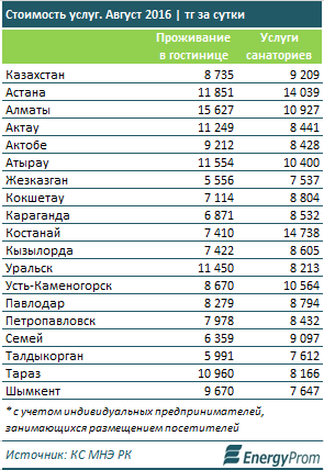 По итогам августа сутки проживания в гостинице стоили в среднем 8,7 тысячи тенге. Это на 11,1 процента больше, чем годом ранее. Самые высокие цены зафиксированы в Алматы (15,6 тысячи), Астане (11,9 тысячи) и Атырау (11,6 тысячи). Услуги санаториев стоили в среднем 9,2 тысячи тенге за сутки. Наибольшее цены отмечены в Костанае (14,7 тысячи), Астане (14 тысяч), и Алматы (10,9 тысячи).