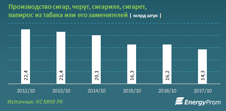 За январь-октябрь текущего года всего в стране произведено порядка 14,3 миллиарда сигар, черут, сигарилл, сигарет, папирос из табака или его заменителей. Это на 11,7 процента меньше объемов выпуска за аналогичный период 2016 года.