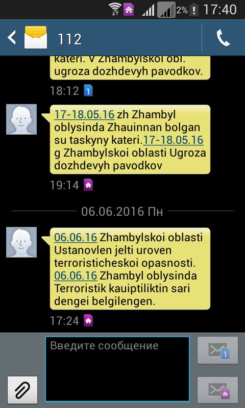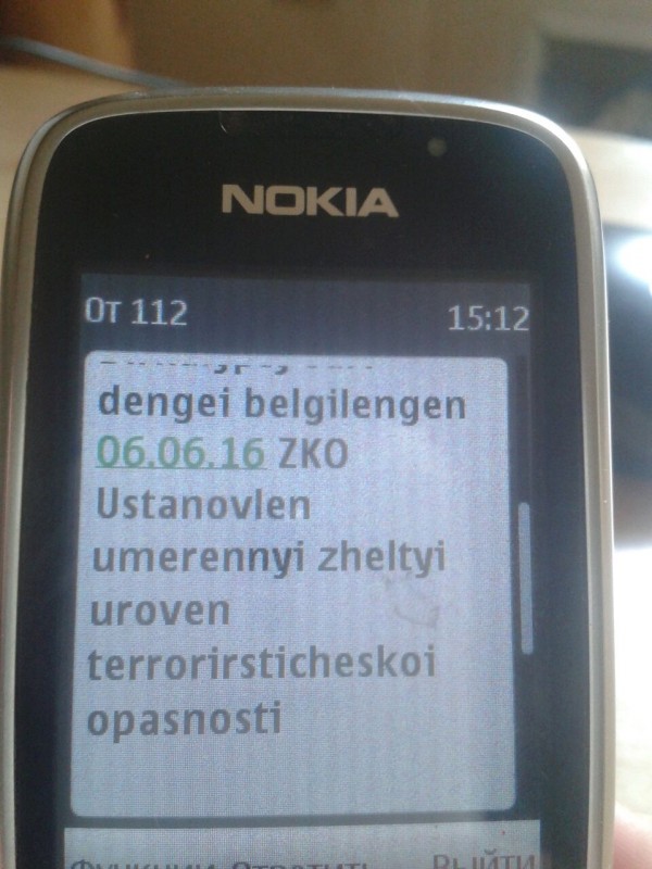 В Казахстане введен желтый уровень террористической опасности. Тревожное известие пришло жителям Западно-Казахстанской, Карагандинской, Алматинской, Павлодарской, Мангистауской, Кызылординской, Жамбылской и других областей, а также Астаны и Алматы, сообщает корреспондент Tengrinews.kz. В начале четвертого вечера казахстанцы стали получать SMS с сообщением о том, что в области введен умеренный – "желтый" уровень террористической опасности.