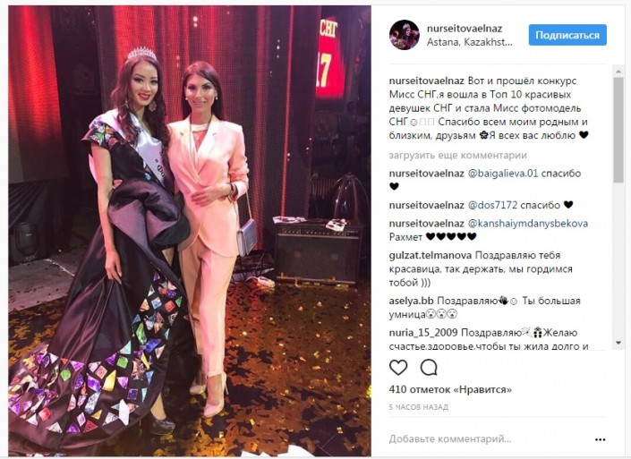 "Первая вице-мисс Казахстан", "Мисс Астана - 2016" вошла в топ-10 конкурса "Мисс СНГ" и завоевала титул "Мисс фотомодель СНГ". Поздравляем Ельназ", - говорится на официальном аккаунте конкурса "Мисс Казахстан" в Instagram.