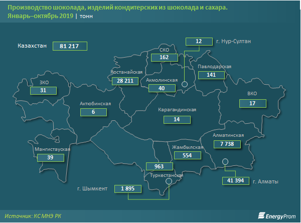 Более половины всего произведенного шоколада и изделий приходится на Алматы - 41,4 тысячи тонн. На втором месте Костанайская область. Здесь сделали 28,2 тысячи тонн изделий, что составляет более трети от всего объема производства. На остальные регионы приходится чуть более 14 процентов от всего выпуска шоколада и кондитерских изделий в стране.