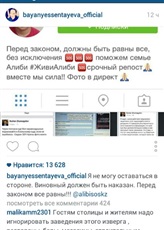 "Перед законом должны быть равны все без исключения. Срочный репост, вместе мы сила!" - под этими словами, которые распространяются под хэштегом #живиАлиби, #помощьАлиби и #MEN_ALIBI, подписались Баян Есентаева, Асель Сагатова, Илья Ильин, Динара Сатжан, Венера Нигматулина, Сая Оразгалиева, Дильназ Ахмадиева, Айкын, Макпал Исабекова, Танирберген Бердонгаров, Мурат Абенов, Анатолий Цой и многие другие.