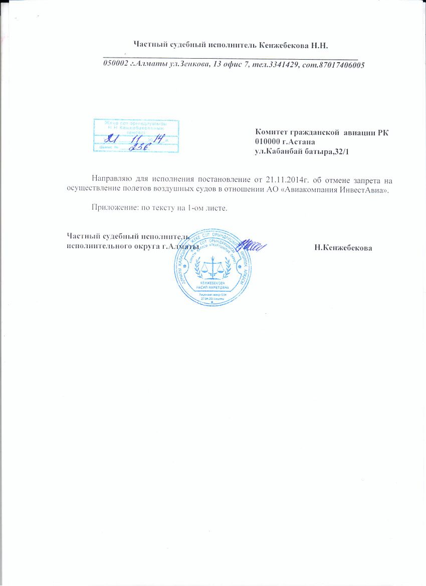 Компания "Инвест Авиа" предоставила еще одно постановление этого же судебного исполнителя, датированное 21 ноября. В нем указано, что перевозчик подал заявление о обязался погасить задолженность перед работником до 1 декабря 2014 года. На основании этого документа судебный исполнитель постановил отменить запрет на осуществление полетов. Однако это постановление судом еще не санкционировано.