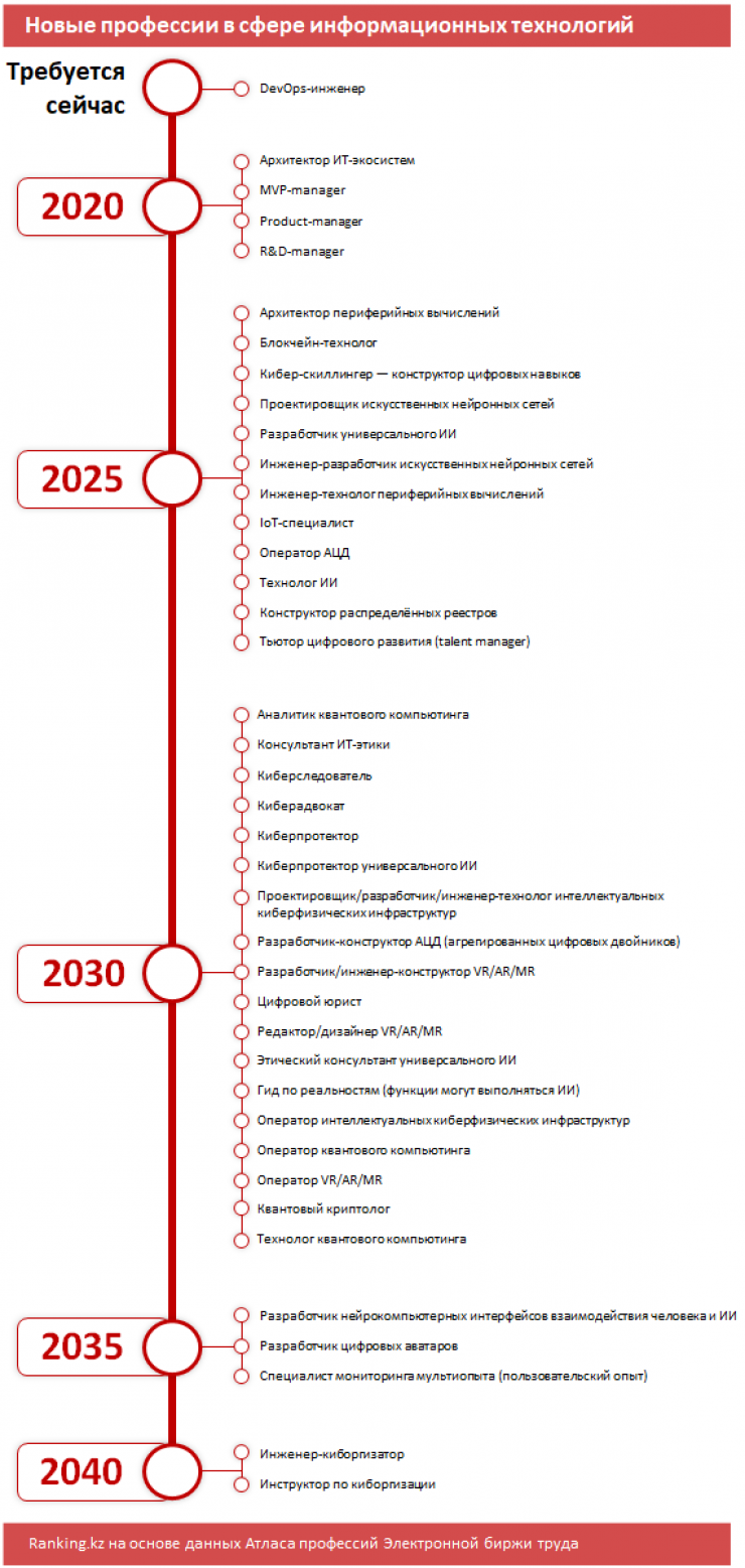 Через четыре года, в 2025-м, страна будет нуждаться в архитекторах периферийных вычислений, блокчейн-технологах, проектировщиках искусственных нейронных сетей, разработчиках универсального ИИ, IoT-специалистах, технологах искусственного интеллекта.