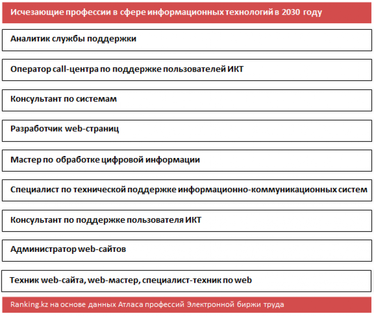 В 2030 году, по данным отраслевых экспертов, исчезнут такие профессии, как аналитик службы поддержки, оператор call-центра по поддержке пользователей, консультант по системам, разработчик web-страниц, мастер по обработке цифровой информации, специалист по технической поддержке информационно-коммуникационных систем, администратор web-сайтов, web-мастер, специалист-техник по web.
