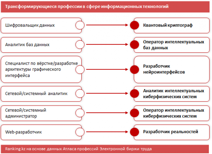 Среди трансформирующихся профессий, по мнению создателей атласа, шифровальщика данных сменит квантовый криптограф, аналитика баз данных - оператор интеллектуальных баз данных, специалиста по верстке или разработке архитектуры графического интерфейса - разработчик нейроинтерфейсов, сетевого и системного аналитика - оператор интеллектуальных киберфизических систем, сетевого и системного администратора - оператор интеллектуальных киберфизических систем, web-разработчика - разработчик реальностей.