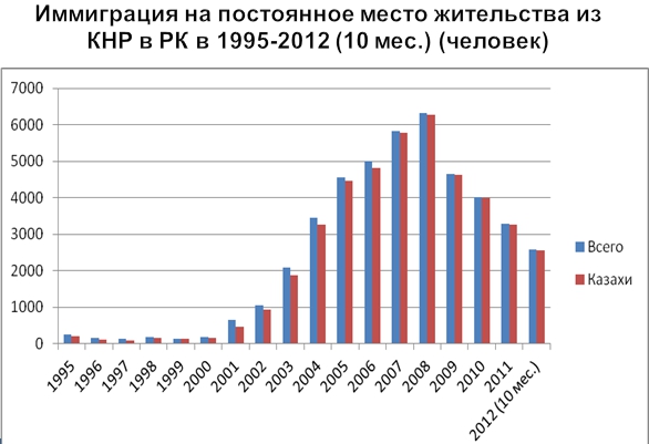 Говоря о китайской миграции в Казахстан на постоянное место жительства, эксперт отмечает, что переехавшие из КНР в редких случаях принимают гражданство РК и не заключают смешанных браков с казахстанцами. Так, по ее данным, за 16 лет зафиксировано лишь 74 брака между этническими китайцами и казахами. С 1993 по 2012 год на ПМЖ из Китая приехали 44,5 тысячи человек, из которых 43 130 человек, или 96,8 процента, - этнические казахи.
