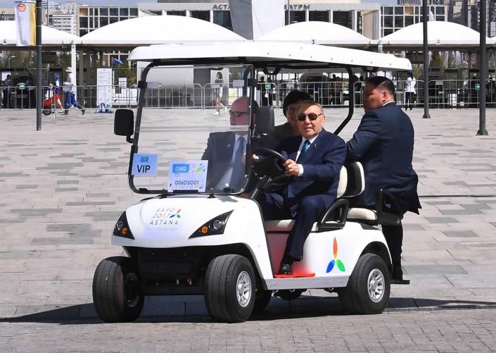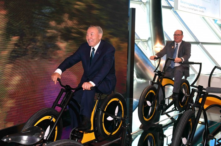 Президент Казахстана ознакомился с инсталляцией "Отображение будущего", макетом проекта по расширению территории Монако, секцией "Зеленая лаборатория" и другими экспозициями, в том числе велосипедом, работающим на солнечной энергии.