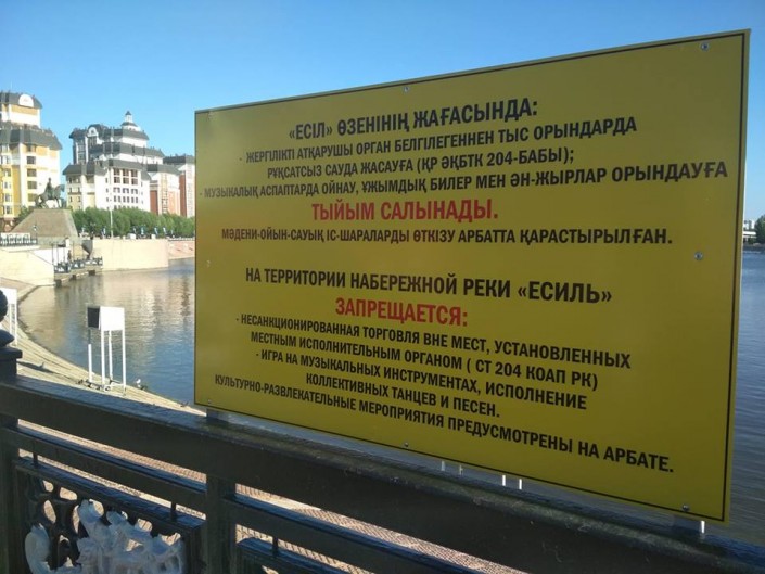 Большая табличка появилась на ограждении вдоль набережной реки Есиль. Вывеска предупреждает, что на территории набережной реки Есиль запрещены несанкционированная торговля, а также "игра на музыкальных инструментах и исполнение коллективных танцев и песен".