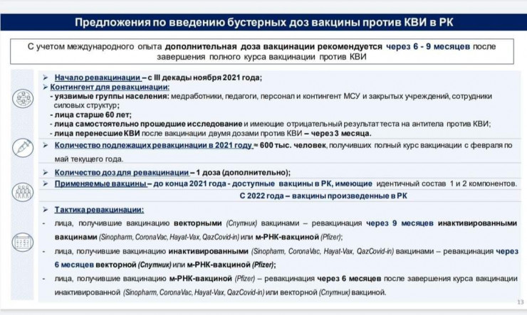 "Таким образом, начало ревакцинации запланировано начиная с III декады ноября 2021 года. Контингент для ревакцинации: группы риска (медработники, педагоги, персонал и контингент МСУ и закрытых учреждений, сотрудники силовых структур); лица старше 60 лет; лица, самостоятельно прошедшие исследование и имеющие отрицательный результат теста на антитела против КВИ", - сообщил Цой.