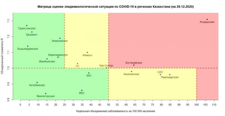 Сообщается, что в "красной" зоне сейчас находятся Атырауская и Костанайская области. Из нее вышли Акмолинская и Павлодарская области, которые попали в "желтую" зону. Кроме них здесь находятся Нур-Султан, Алматы и СКО.