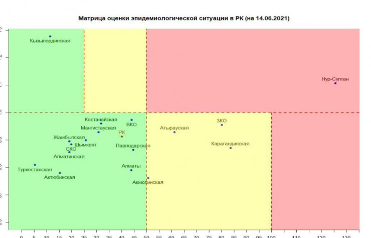 Согласно матрице оценки эпидемиологической ситуации в регионах Казахстана на 14 июня, в "красной" зоне остается Нур-Султан.