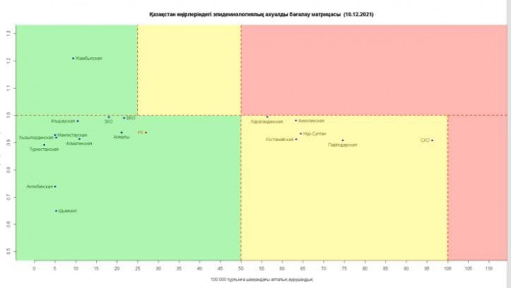 Обновилась матрица оценки эпидемиологической ситуации в регионах Казахстана на 10 декабря 2021 года, передает Tengrinews.kz со ссылкой на Межведомственную комиссию по нераспространению COVID-19.