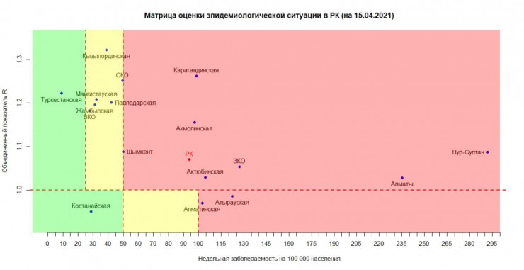 В "желтой" зоне - Восточно-Казахстанская, Жамбылская, Кызылординская, Павлодарская, Северо-Казахстанская, Мангистауская области.