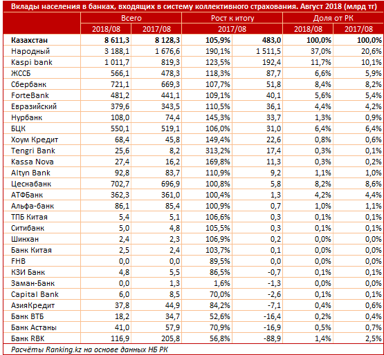 Совокупная сумма вкладов населения в банках, входящих в систему коллективного страхования, на конец августа текущего года составила 8,6 триллиона тенге, что на 483 миллиарда (5,9 процента) больше, чем в прошлом году.