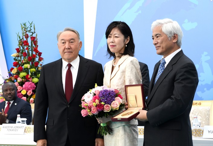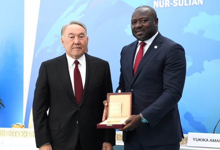 Нурсултан Назарбаев лично вручил премию  Лассине Зербо, а также супруге и брату покойного Юкии Амано.