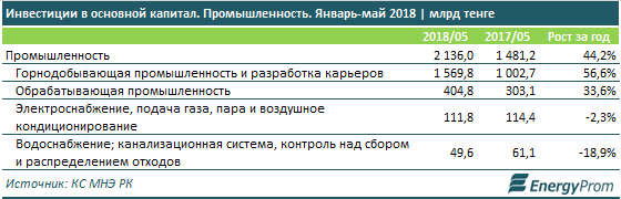 Почти три четверти всех капиталовложений в промышленность направлены в горнодобывающий сектор - 73,5 процента, или 1,6 миллиарда тенге, что на 56,6 процента больше, чем год назад. Еще 19 процентов пришлось на сегмент переработки - 404,8 миллиарда тенге, что на 33,6 процента больше, чем годом ранее. В энерго- и водоснабжение влили менее 8 процентов от всех инвестиций в промсектор.
