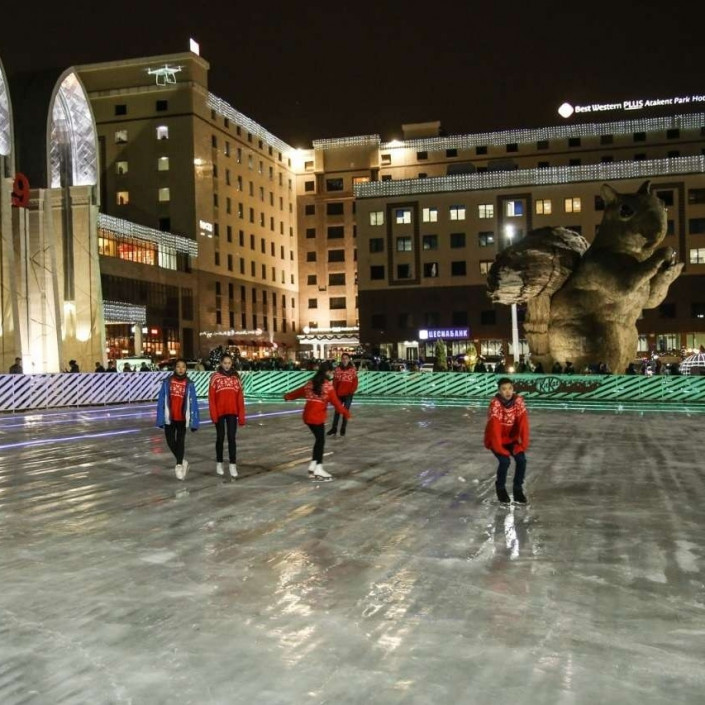 Каток на площади возле ТЦ "MART" - самый маленький бесплатный каток в Алматы. Его площадь - примерно 2,2 тысячи квадратных метров. Он расположен вблизи парковки и имеет классическую прямоугольную форму. В выходные он работает с 10.00 до полуночи.